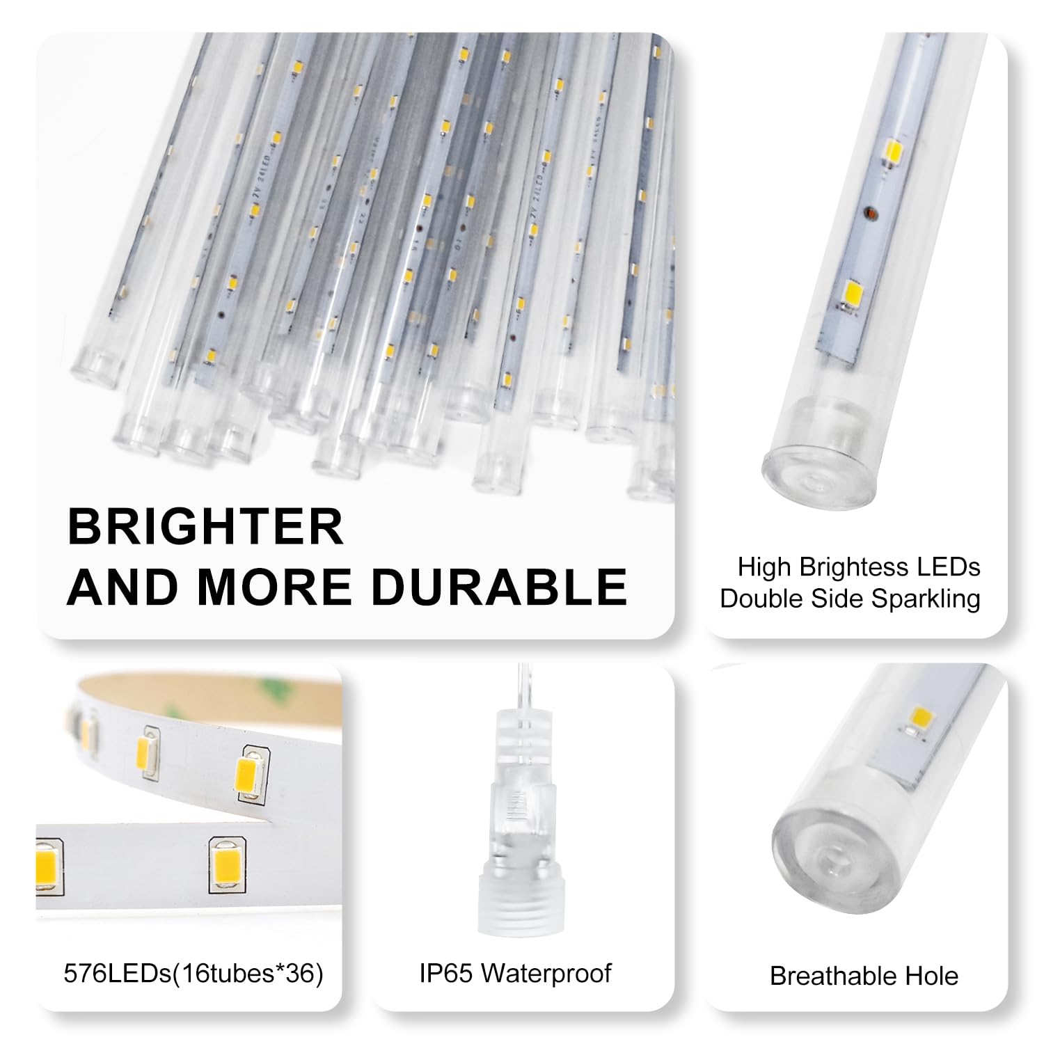 - 【Romantic Meteor Shower Lights】Ice Rain Effect: The Pemotech 15.05-Meter Meteor Shower Light String Creates A Stunning Ice Pillar Effect, Adding An Impressive Touch To Your Christmas Lights Outdoor Decorations. These Icicle Christmas Lights Outdoor Bring An Enchanting Glow To Your Home Or Garden, Perfect For The Holiday Season.Rolling Effect: With 576 Led Beads (16 Pvc Tubes, Each Containing 36 Leds), These Meteor Shower Lights Light Up And Fade In Sequence, Mimicking A Meteor Shower. The Dazzling Lights Create A Magical Atmosphere For Your Outdoor Christmas Decorations, Making Your Christmas Decorations Outdoor Extra Special And Unforgettable.