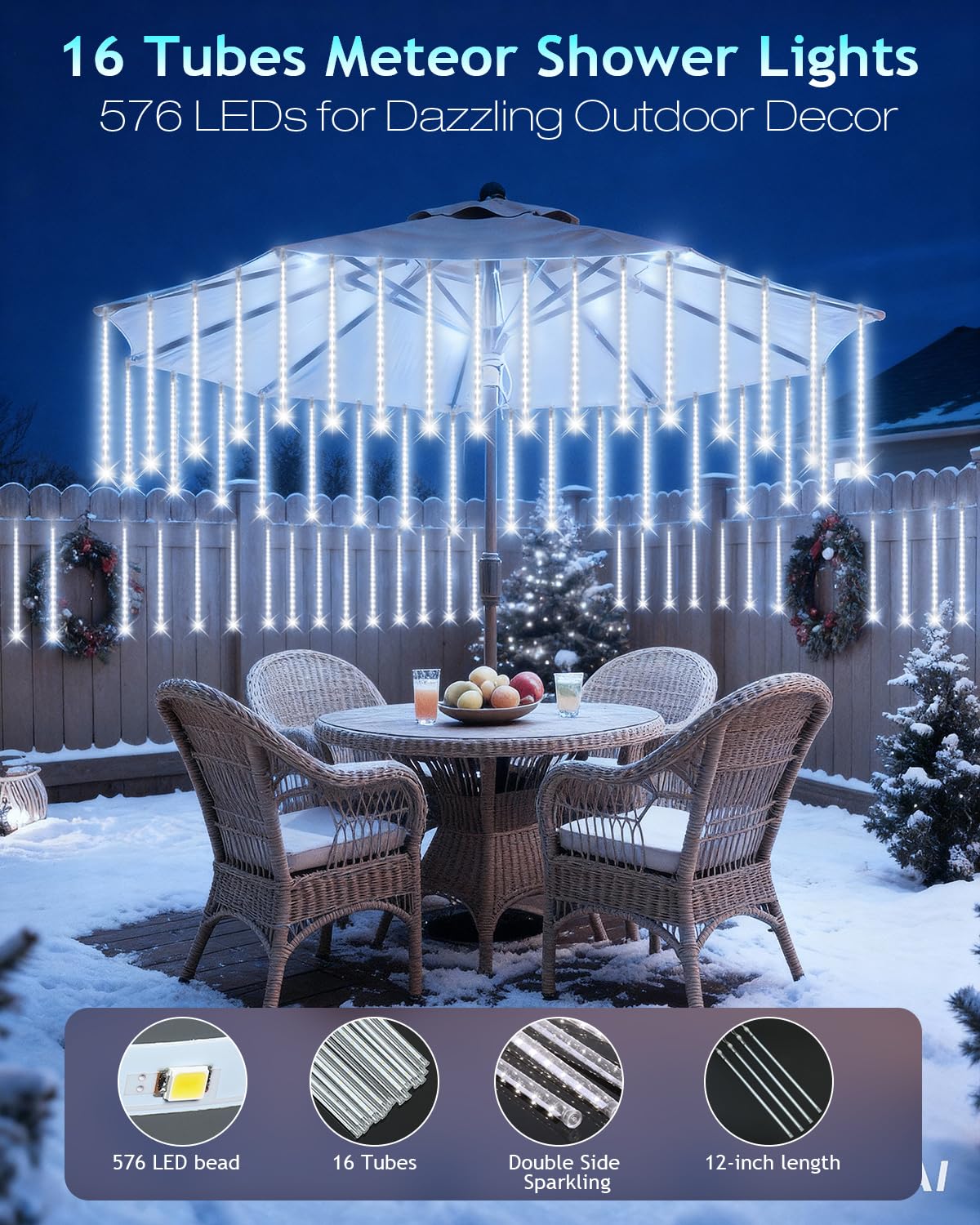 PEMOTech Christmas Lights Outdoor,16 Tubes 576 LED 16 Inch,Meteor Shower Lights Outdoor,Waterproof Icicle Lights,Luces Navideñas para Exteriores,White,50 ft for Christmas Tree,Party,Garden Decor